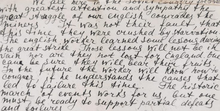 We all here in the Soviet country followed with greatest attention and sympathy the great struggle of our English comrades the miners. It was not their fault that this time they were crushed by starvation. The English worker learned some lessons during the great strike. These lessons will not be in vain… One can be sure they will bear their fruits. In the future the worker will know how to conquer, if he understands the causes that led to failure this time.