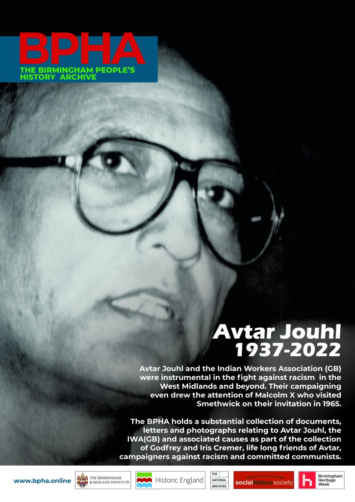 Our Director and a founder of the BPHA Katherine Cremer spoke about the culture of the IWA(GB) in the 1980’s and early 1990’s, about the central role of Avtar and his friendship with her family. Katherine was was joined by Jag Johal, Avtar’s son and today a leading campaigner in Birmingham against racism and discrimination, remembering Avtar and the important work undertaken by the IWA(GB). From the 1960s up until his death, Avtar Jouhl ensured that the IWA was at the forefront of anti-racism campaigns as they continued to challenge trade union members, factory owners, and publicans. It was this campaign that attracted the US civil-rights leader, Malcolm X to Smethwick, bringing much needed attention to the struggle. This undoubtedly aided in the eventual outlawing of the colour bar in the town’s pubs in the Race Relations Act of 1965, paving the way for Britons of Indian heritage to become publicans themselves. Avtar Jouhl is considered one of the giants of the IWA and in the words of his son, Jagwant Jouhl, “in honouring his legacy we need to progress matters going forward and build on those legacies that our forefathers achieved”. A full recording of the event is being prepared and will be made available on our website and youtube, visit www.bpha.online. The BPHA wishes to formally thank the Social History Society for all its support in making this event happen.